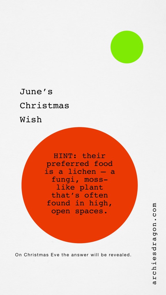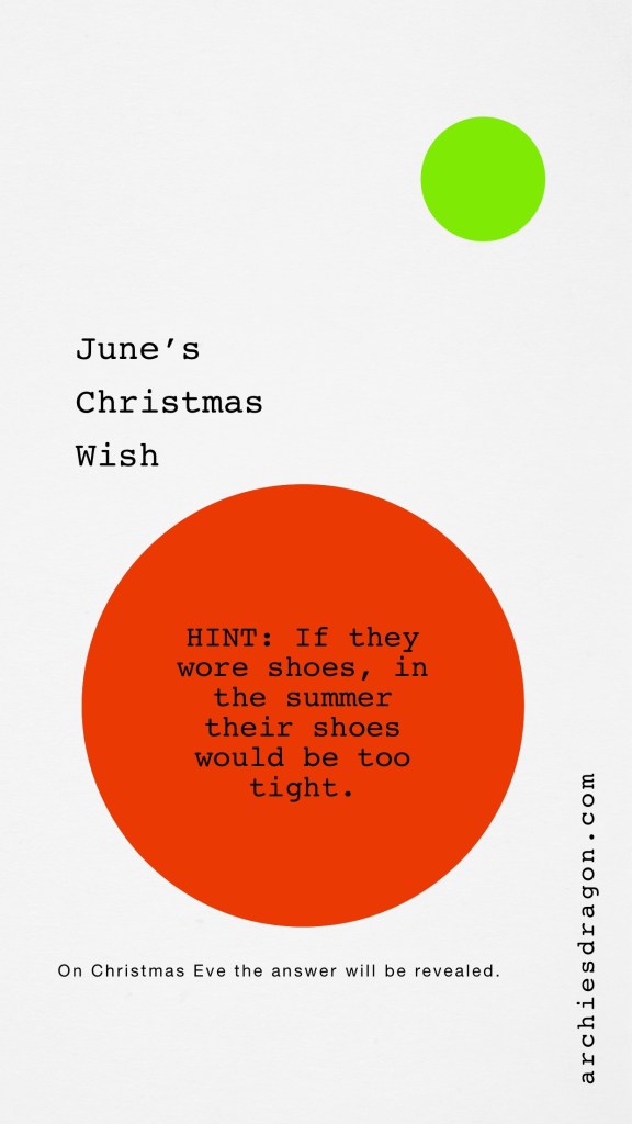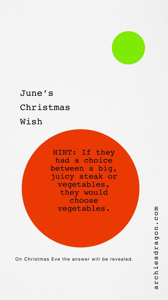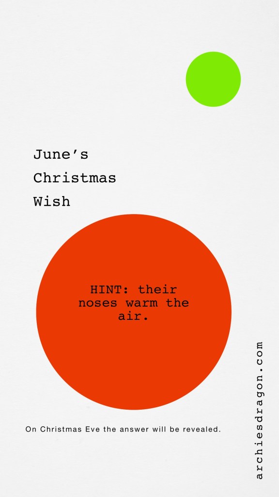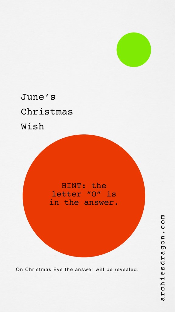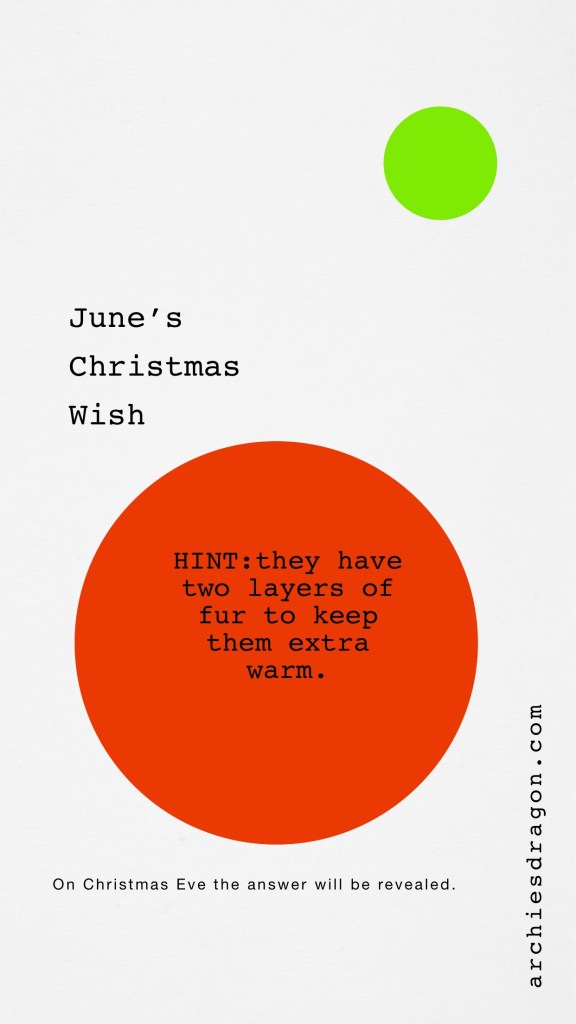 Beginning December 1st, June will provide a hint that will help you figure out what she wants Oma to make her for Christmas. She wants a magical creature like Naga. On December 24th, Christmas Eve, the answer will be revealed. On certain days there may only be a letter from the alphabet. Keep that letter on a piece of paper. Then unscramble.